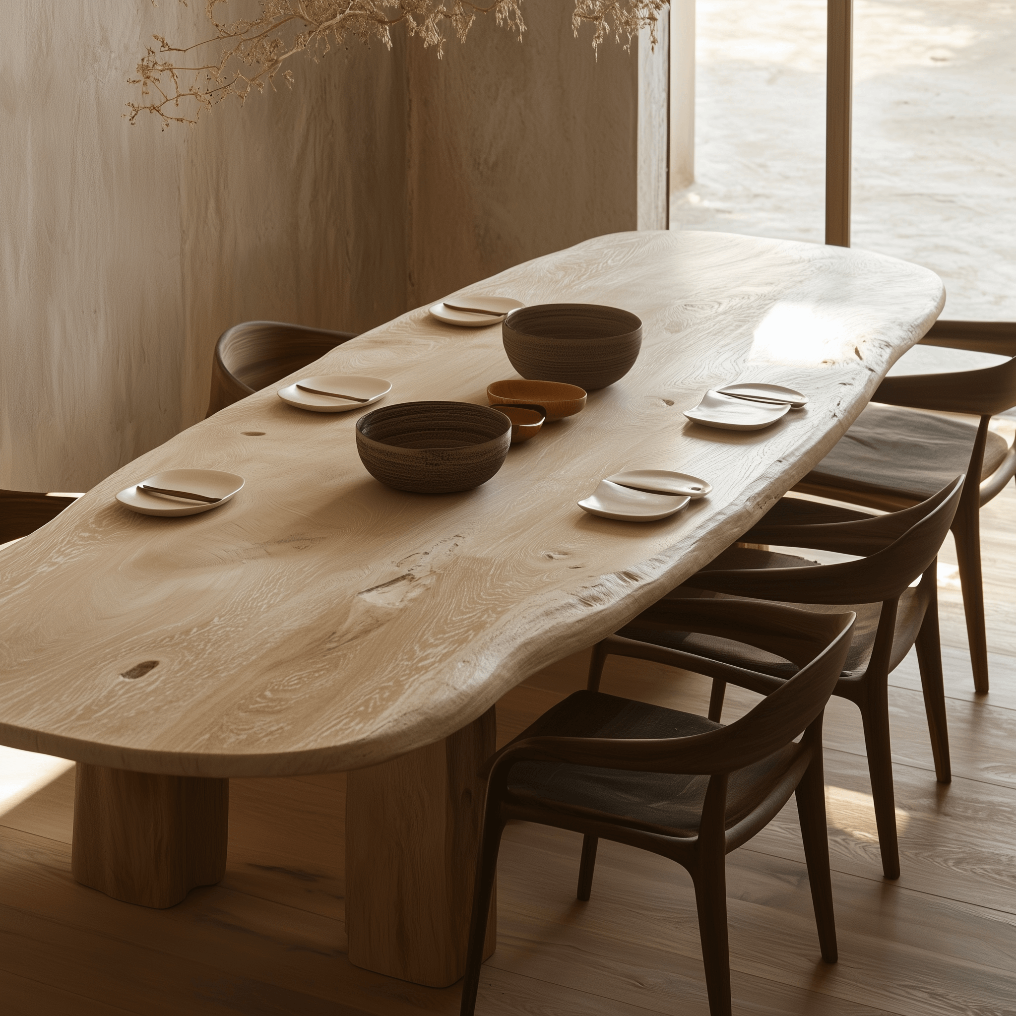 La mesa ovalada Mizu está disponible en una variedad de acabados. El acabado de madera natural realza la veta orgánica de la madera, mientras que el acabado negro elegante agrega un toque moderno. El acabado blanco blanqueado crea una sensación ligera y aireada, perfecta para espacios de inspiración costera o mediterránea .