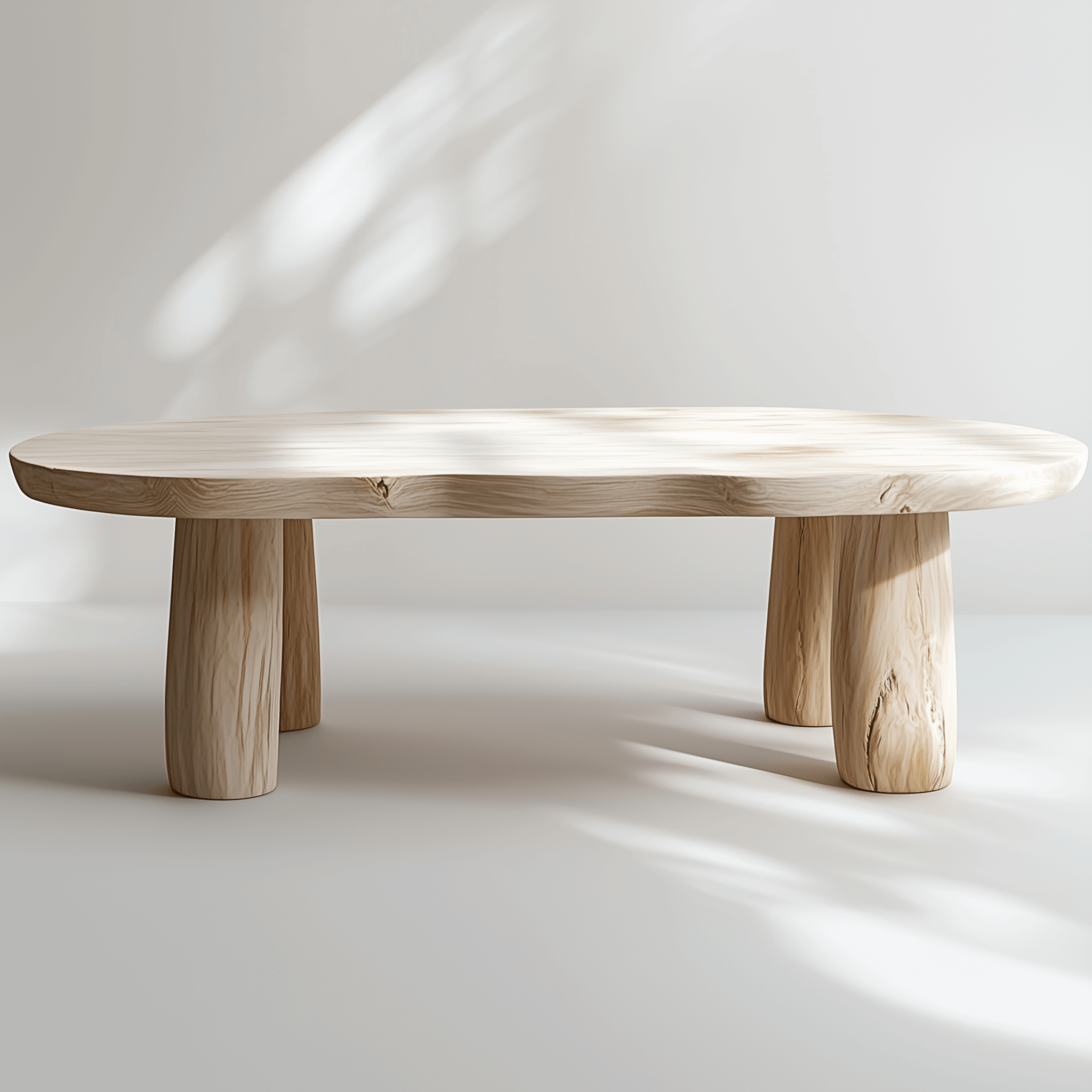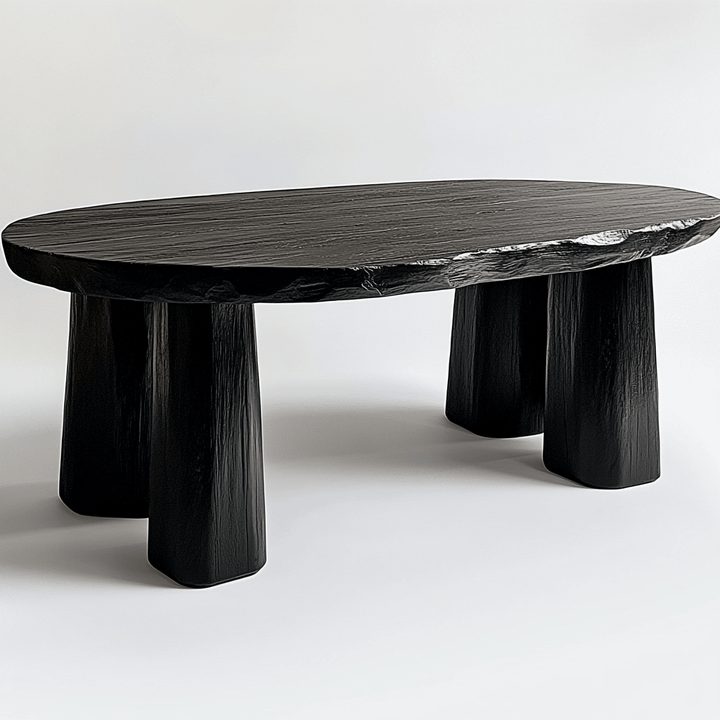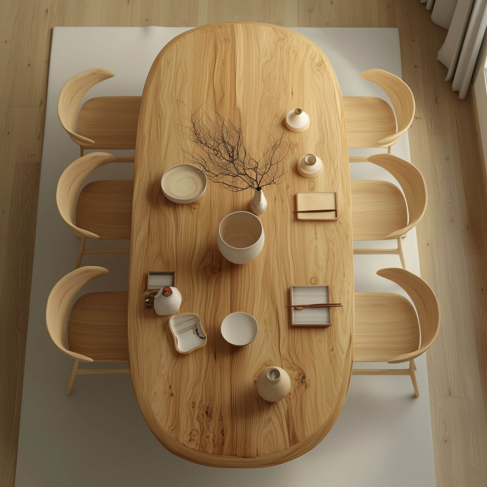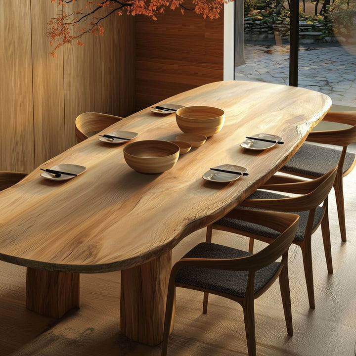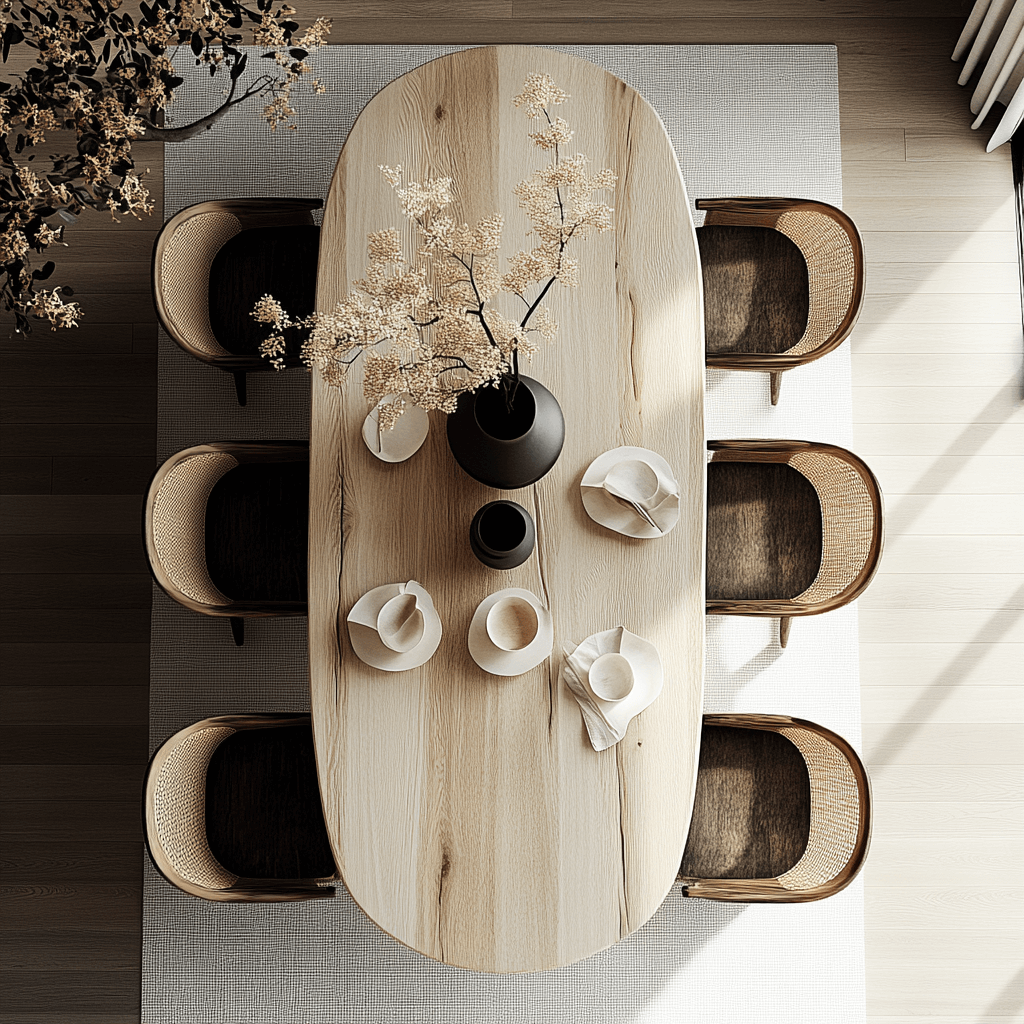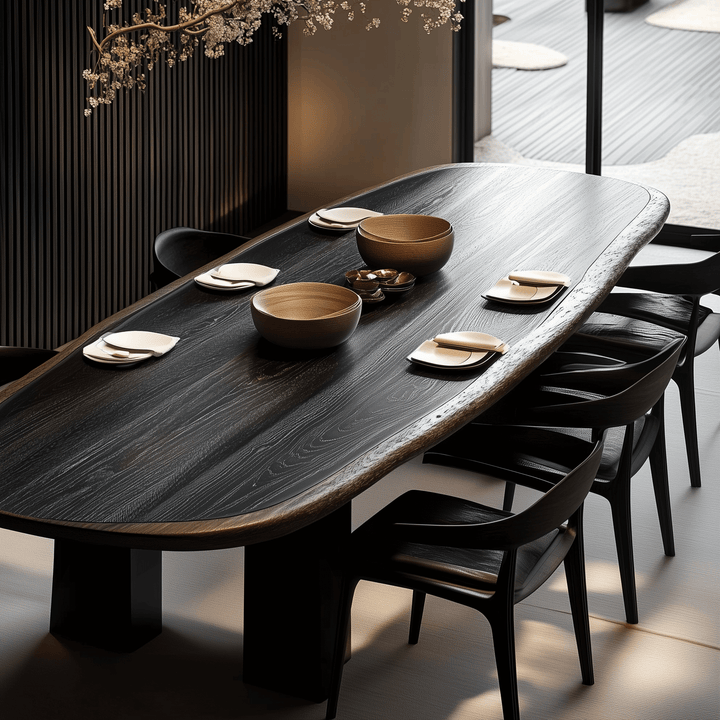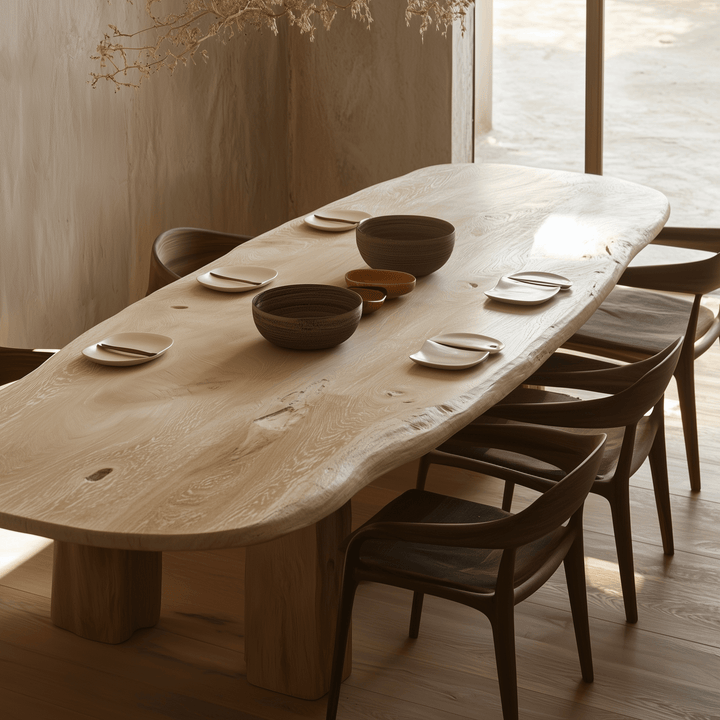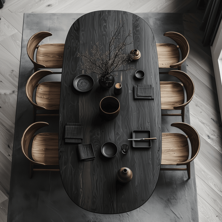 The Mizu Oval Table is available in a variety of finishes. The natural wood finish enhances the wood's organic grain, while the sleek black finish adds a modern touch. The bleached white finish creates a light, airy feel, perfect for coastal or Mediterranean-inspired spaces.