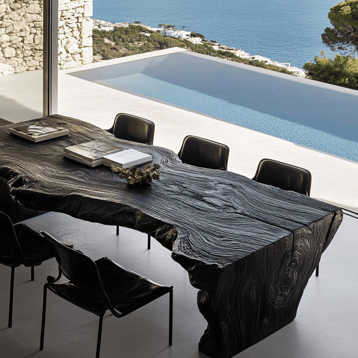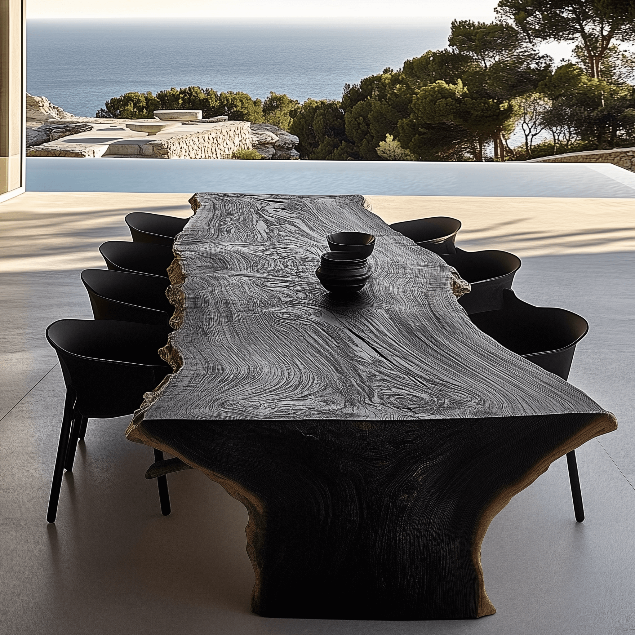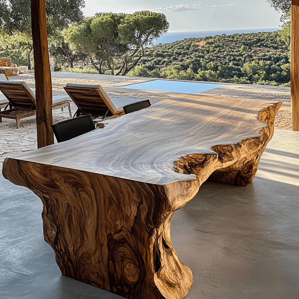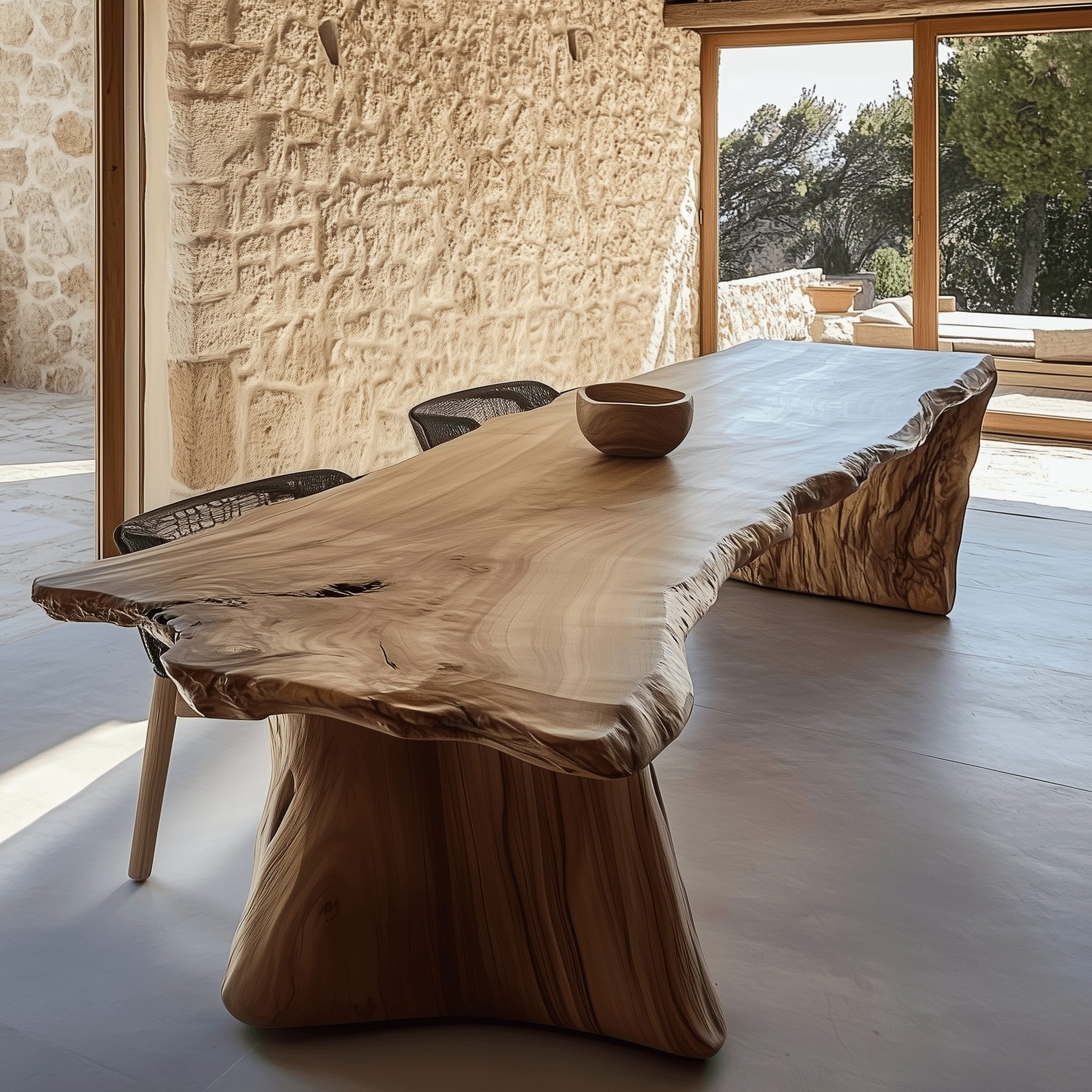 The Sora Table is an extraordinary fusion of organic beauty and modern design, meticulously crafted from a single log. On one side, the table is supported by the natural, uncarved shape of the log, while the opposite side features a machined square block leg, creating a stunning contrast between nature’s raw form and geometric precision. This unique combination of organic flow and modern structure makes the Sora Table a sculptural centerpiece, ideal for private homes, restaurants, hotels, and boutique spaces.